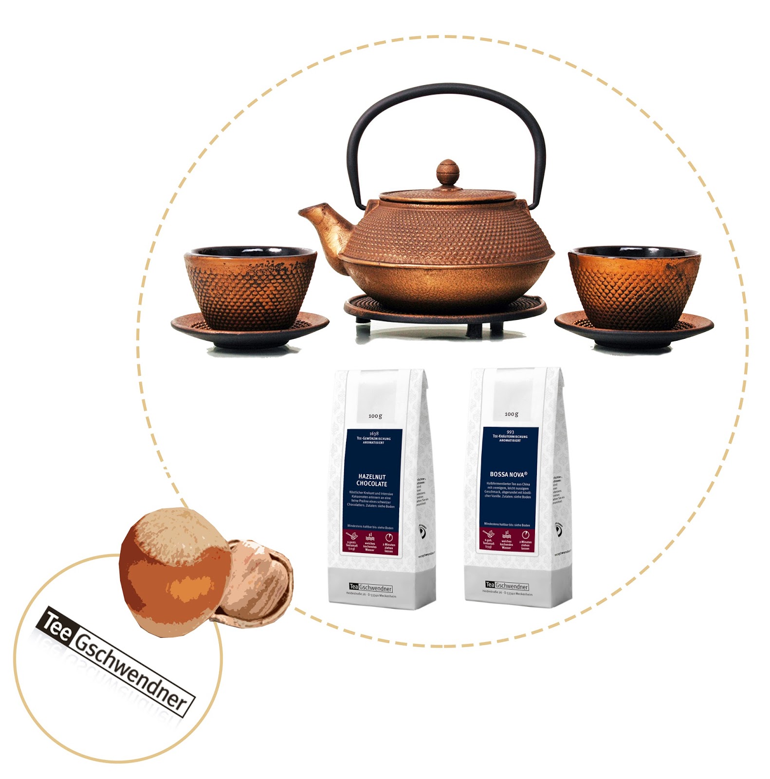 Als Gewinn gibt es eine wunderschöne Teekanne mit Tassen und zwei aromatische Teesorten. Das Modell ARARE gehört zu den beliebtesten Vertretern der gusseisernen Teekannen. Das klassische Nagelkopfdesign symbolisiert den asiatischen Minimalismus und ist ein Muss für alle Liebhaber der asiatischen Teekultur. Das Set besteht aus einer roten Teekanne à 0,8 Liter, einem Gussuntersetzer und 2 TeaCups mit Untertassen. Hazelnut Chocolate Nr. 1638 – ein aromatisierter Schwarztee mit köstlichem Krokant und intensiven Kakakonoten und Bossa Nova® Nr. 993 – aromatisierter Oolong-Tee mit einem leicht nussigen Geschmack und einem Hauch von Vanille runden den tollen Gewinn ab. Wenn ihr mehr über den feinen Tee erfahren wollt, dann klickt einfach hier oder schaut doch einfach mal bei eurem TeeGschwendner Fachgeschäft vor Ort vorbei.